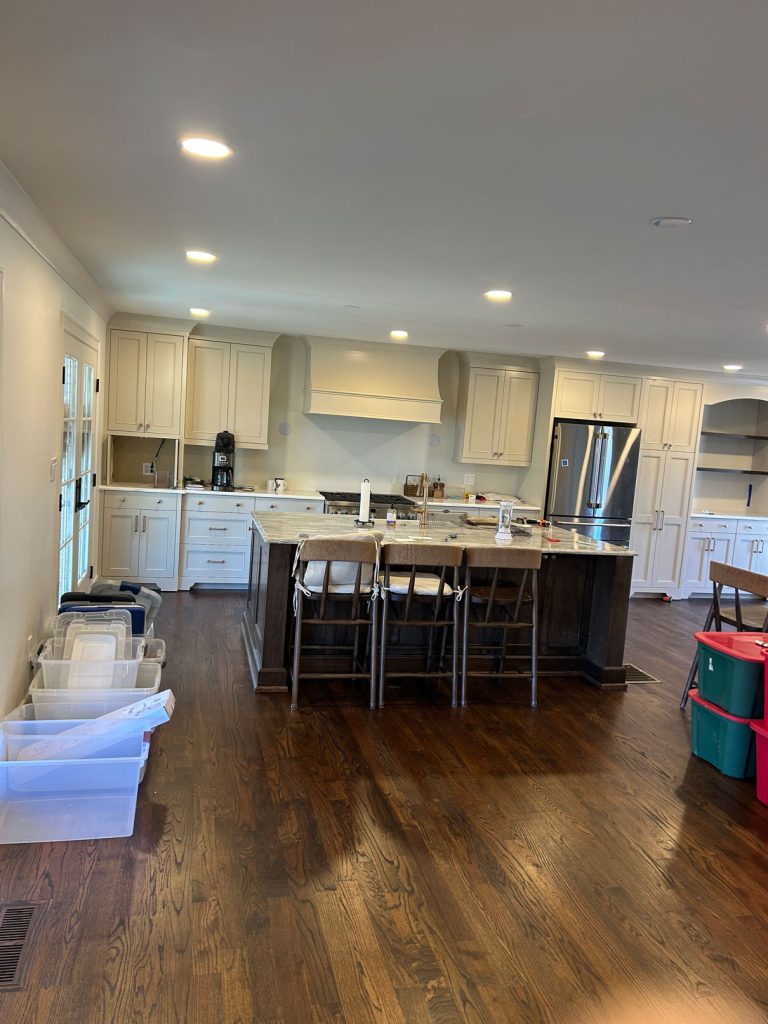 Pantries removed, center countertop with cabinets below to replace the pantry space, new everything and a wide open space. We did it all.